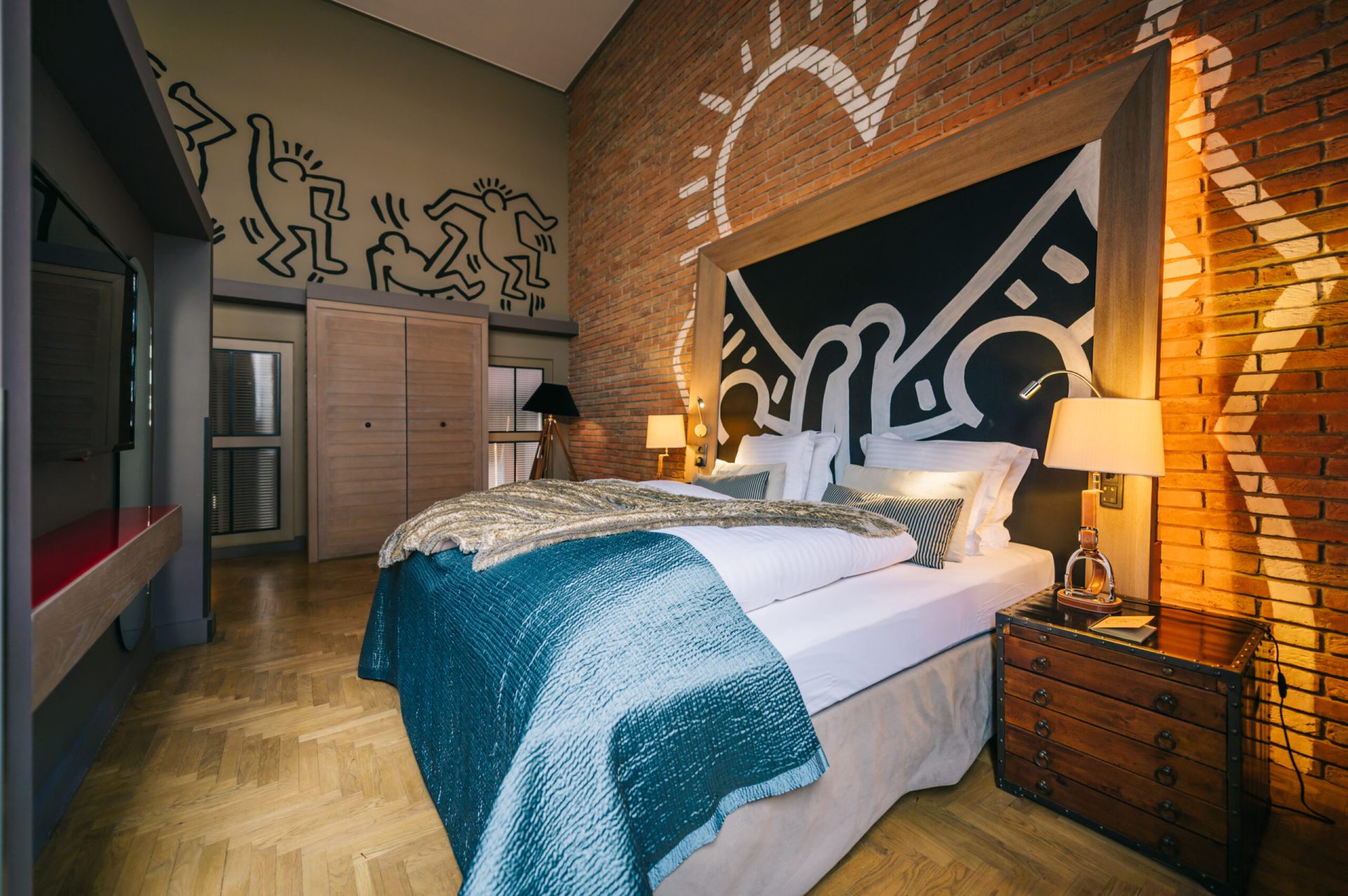 The eclectic nature of the public spaces is carried on into all rooms featuring an innovative mix of color, texture, artwork, and graphic design
